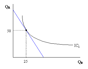 Solving (1) and (2) simultaneously (e.g. using algebraic substitution), we find that Marge will buy 25 units of beer and 50 units of pork rinds. Her indifference curve graph appears as: