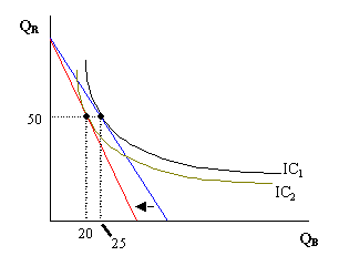 Again, solving (1a) and (2a) simultaneously, we find that Marge will buy 20 units of beer and 50 units of pork rinds. The budget constraint shifts inward, and she moves to a new, lower indifference curve as follows: