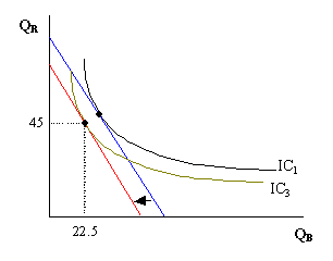 Again, solving (1b) and (2b) simultaneously, we find that Marge will buy 22.5 units of beer and 45 units of pork rinds. On a graph, we see the budget constraint shift in parallel as Marge moves to a new, lower indifference curve (IC3):