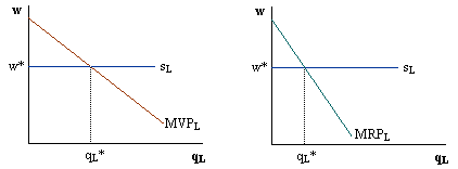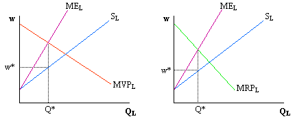 In both situations, and in the absence of any unionization, the wage is determined by where the vertical dotted line (coming down from the intersection of either MVPL and MEL to Q* on the left graph or from MRPL and MEL to Q* on the right graph) crosses the labor supply curve. The wage in each case is given as w*.