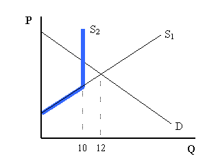 For individual consumers, the blue line (S2) represents what the Supply curve facing them would look like after the quota. Prior to the quota, the Supply curve is S1. Their individual demand curve is depicted as D.
