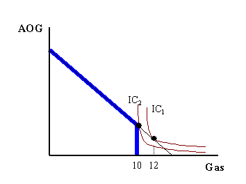 Note that group 1 locates at a point above the “kink” because their gas consumption exceeds 20 gallons (the minimum amount). Group 2 does not locate above the “kink”, however, because they would consume only 12 gallons if this were actually a $40 increase in income. That is, group 2 will have to locate on a lower indifference curve than that found above and correspondingly achieve a lesser amount of utility. Because group 2 is “forced” to consume 20 gallons of gas, they will purchase 50 units of all other goods. This yields utility of about 45.6.