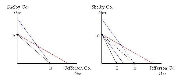 Note here that the gas sold in these different locations represent two goods which are close substitutes for people living on the border of these two counties. This implies that the indifference curves associated with buying gas in Jefferson and Shelby County are linear or nearly linear. We can assume that the price of gas in the two counties was the same until June 1st, when the price of gas in Jefferson County increased. This tells us that the slope of the budget constraint is nearly one before June 1st and greater than one afterwards (if Shelby County gas is on the vertical axis of our graph).